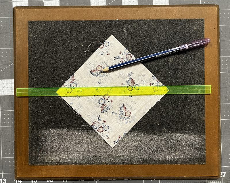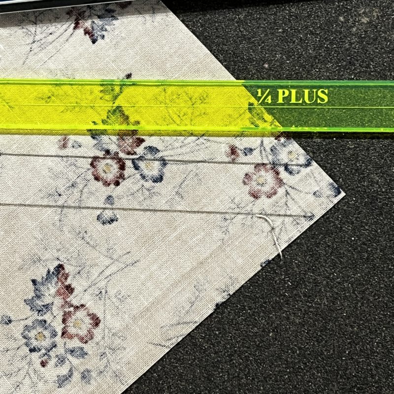 This week I took out my ‘trusty sandpaper board’ my dear Dad made me many years ago – (sadly passed away in 2013, aged 70) – it is a well used and loved tool here in the Studio. Together with my little ¼” Plus ruler, drawing the lines across the block this week, I aligned the centre marking with two opposite diagonal points, and drew either side for the stitching lines, which is all you need as the blade will cut them apart when stitching the second line. The sandpaper board grips the fabric when drawing on the block. These two ‘tools’ though so simple, truly make a huge difference!