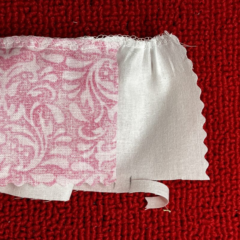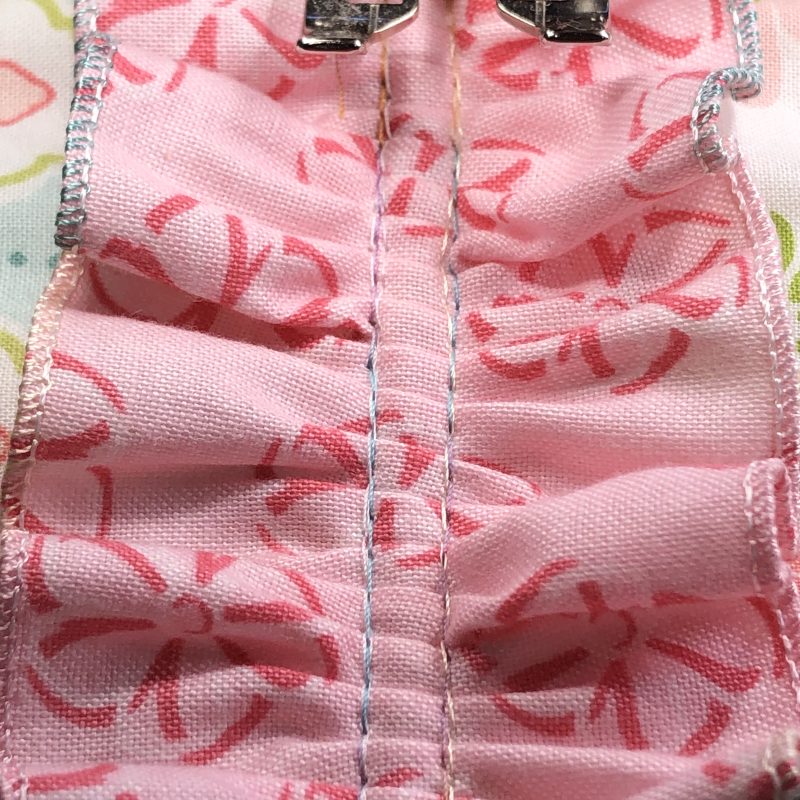‘Gathering onto a Casing’ – same technique as ‘Gathering to a Flat Piece’ however the top fabric is folded right sides together to create a casing for elastic etc.