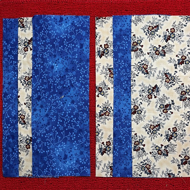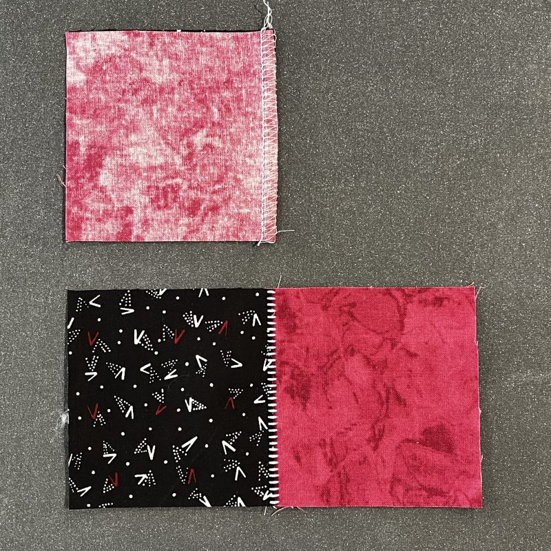 Step One: Construct two 4-Patch small blocks using the eight 3 ½” squares as per 4-Patch Block’s technique – fabrics RST to stitch – gently pull seams apart to see decorative ladders on right side of the fabric. Press.