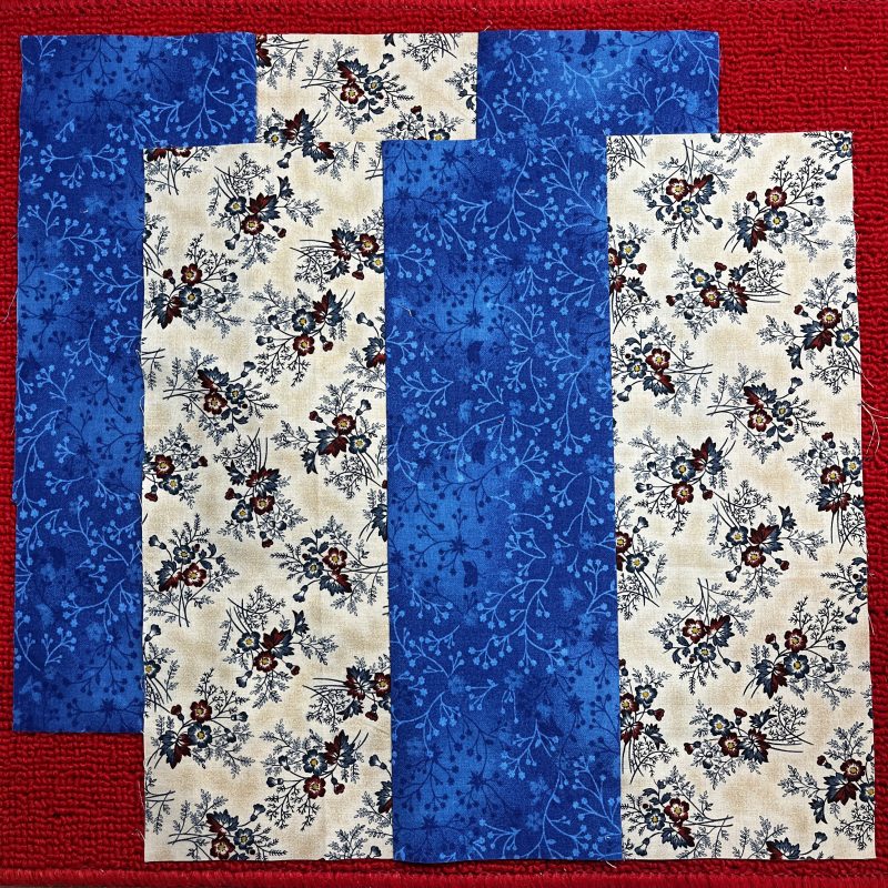 Sample Prep: Cut 3 Strips of Dark fabric – 4 ½” x 13 ½” and 3 Strips of Light fabric – 4 ½” x 13 ½” … Please note the BBOSQ has an error!! Page 129 –measurement read 4 ½” x 12 ½” … Strips should be 4 ½” x 13 ½”