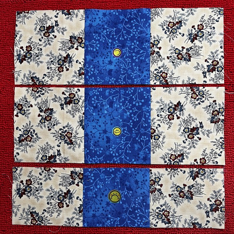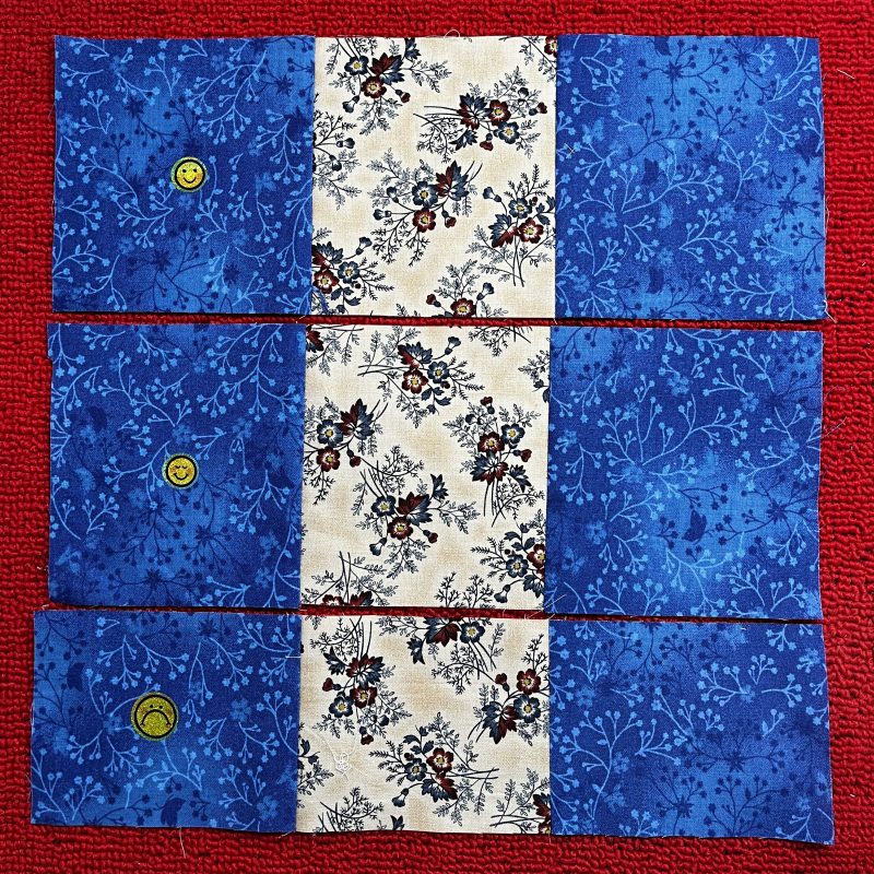 Step One: Divide Strips into two sets – Stitch with RST. Cut each stitched group into thirds. (3 strips @ 4 ½” = 13 ½” … not 12 ½” as per in the book!) I had precut all my strips as per the books instructions – so my three strips were … two @ 4 ½” and one @ 3 ½” – photos with smiley faces are correct – other one is not!