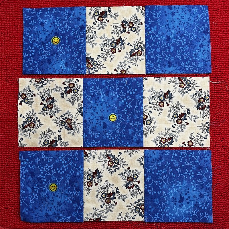 Step Three: Stitch the top three ‘squares’ into a strip. Repeat for the centre squares, and lastly, the bottom row of ‘squares’.