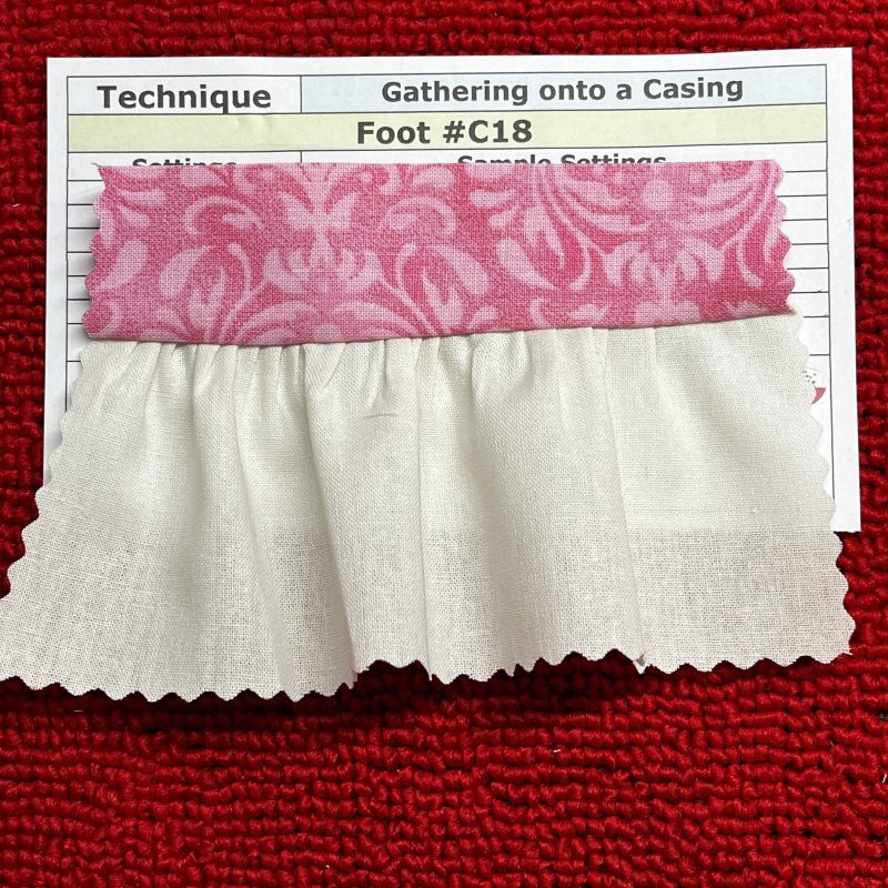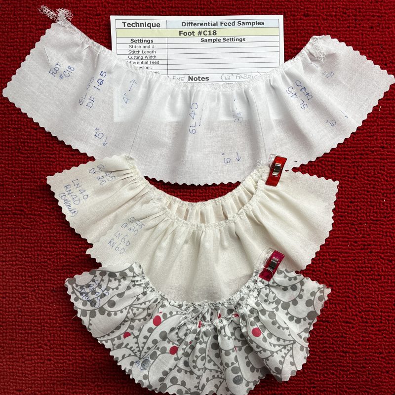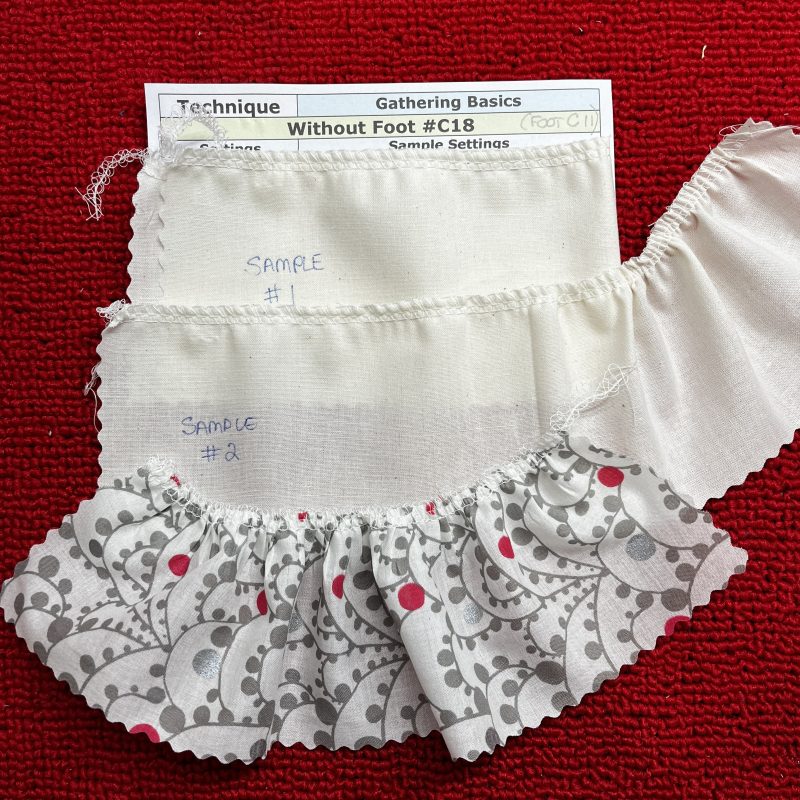 ‘Gathering Basics – Using Foot #C11’ – Sample #1 SL 4.5 DF 2 results in a very slight gather. Sample #2 I pulled up the needle threads to create a fuller gathered edge. Sample #3 i changed to a finer weight fabric, and increased both needle tensions to 6.0, resulting in a nice gather on this fabric just with the machine.