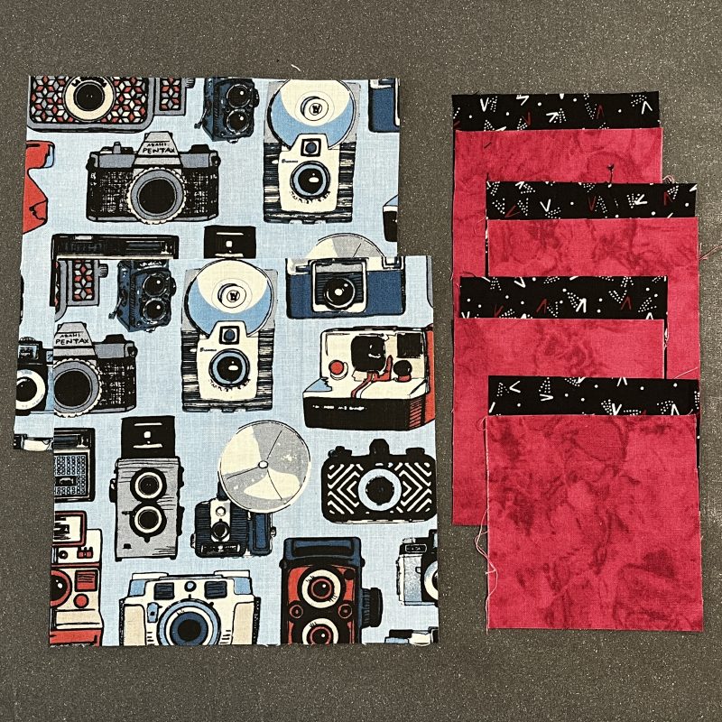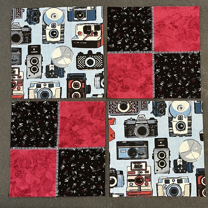 Sample Prep: Cut 2 squares @ 6 ½” each, 8 squares @ 3 ½” (2 different fabrics)