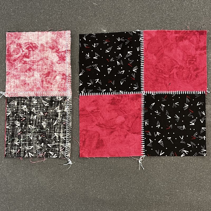When I was cutting samples this week for this section, I noticed I had left out a block two weeks ago! So here’s the Double Four Patch Block (Big Book of Serger Quilting Page 127) that should have been included within the Piping Feet #C16S etc Blog Post.