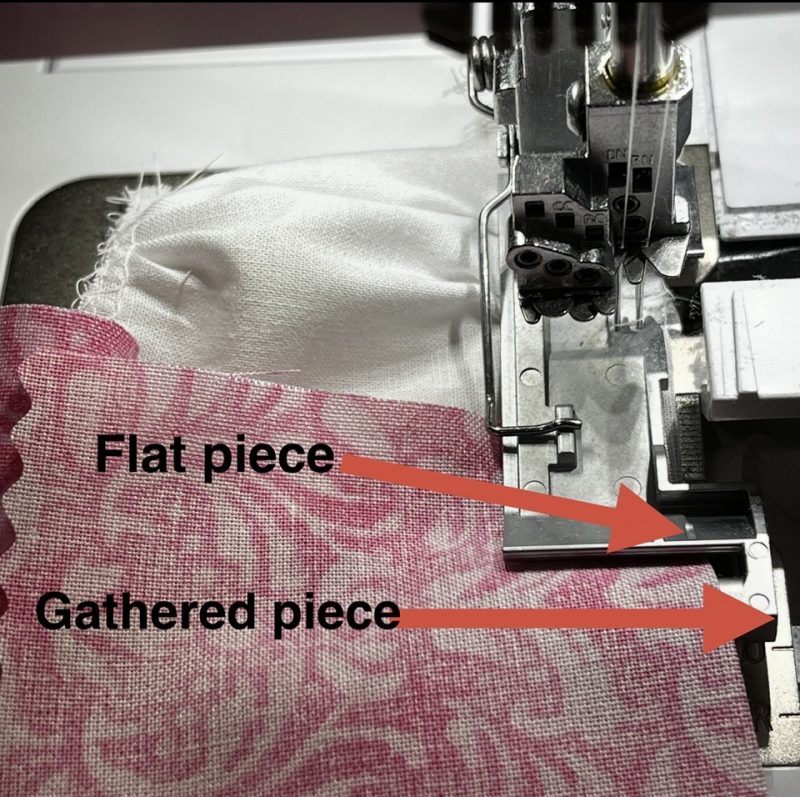 ‘Gathering to a Flat Piece’ – start with two layers right sides together under the foot, and handwheel or needle up/needle down to hold them together. SL 4.5 DF 2.0 CW 6.0 – rest of settings Default. I trim off a small section from the underneath fabric, about the length of the foot, and approx 1/4” wide. Here is where I place them under the foot – flat fabric lines up with the marking for the blade on the foot … and lower fabric to be gathered is lined up to right hand edge of foot. STITCH SLOWLY! The bottom layer of fabric will want to ‘gallop’ in, so guide gently.