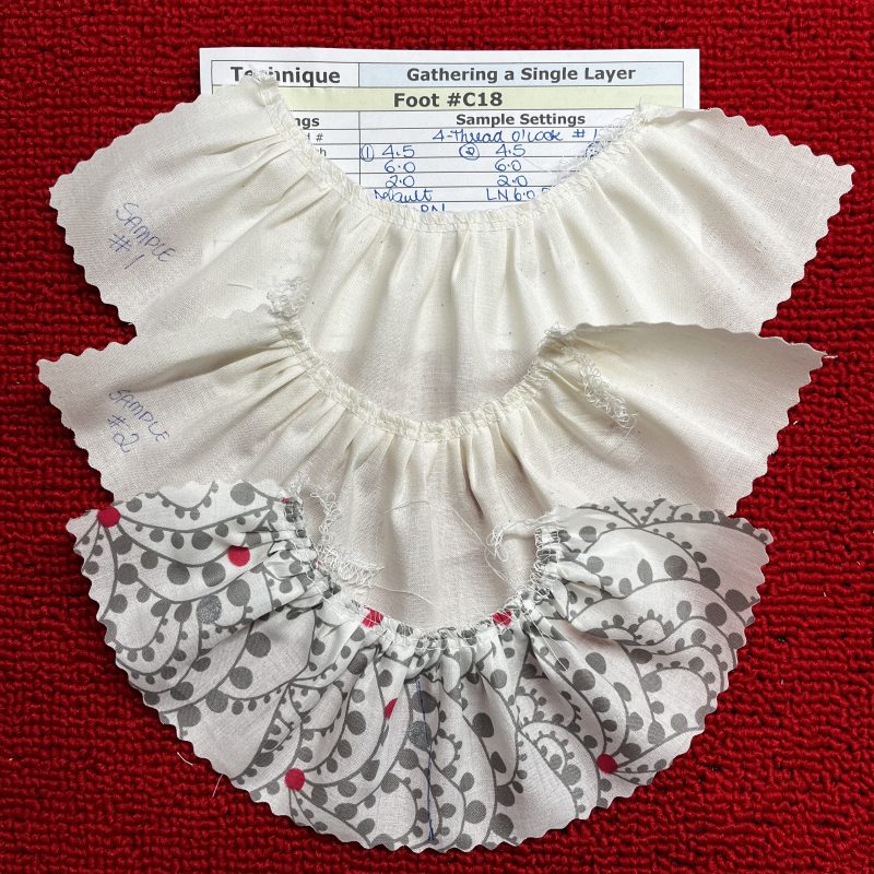 4-Thread Overlock Stitch #1 for all samples this week, and 4 cones of Seracor Overlocking thread. Settings noted in sample descriptions. I started with Gathering Basic samples using Foot #C11 to show the difference Gathering Foot #C18 makes. Single layers sample pieces were cut 12” long.