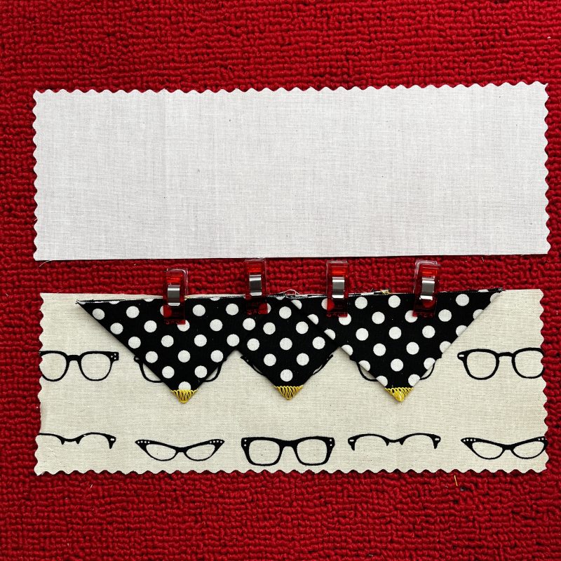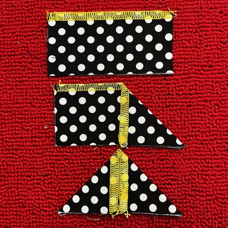 Step One: Fold each of the squares in half, wrong sides together and press. Stitch along the fold without cutting to create a trimmed edge. Fold again into triangles with the right side of the stitch now on top.
