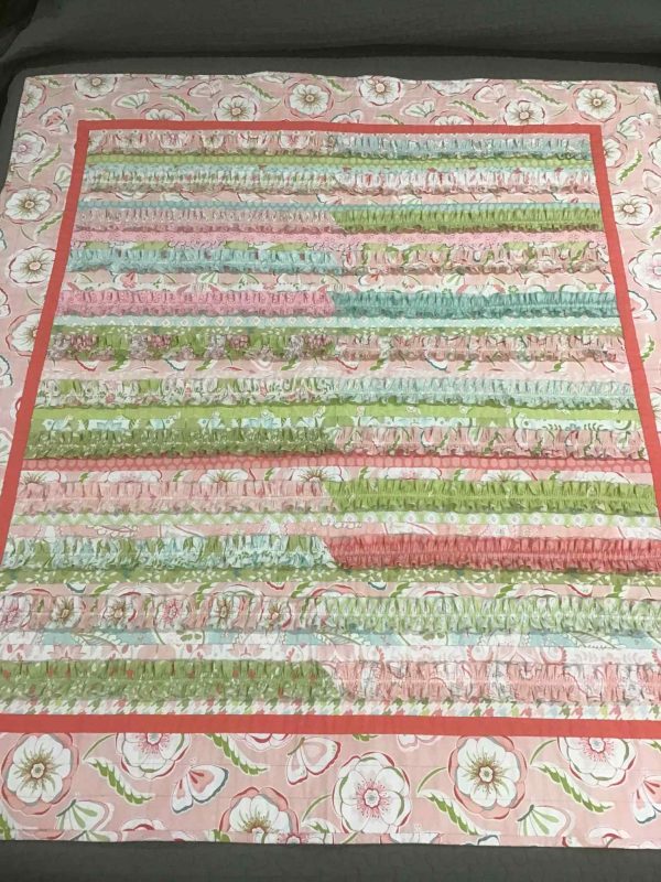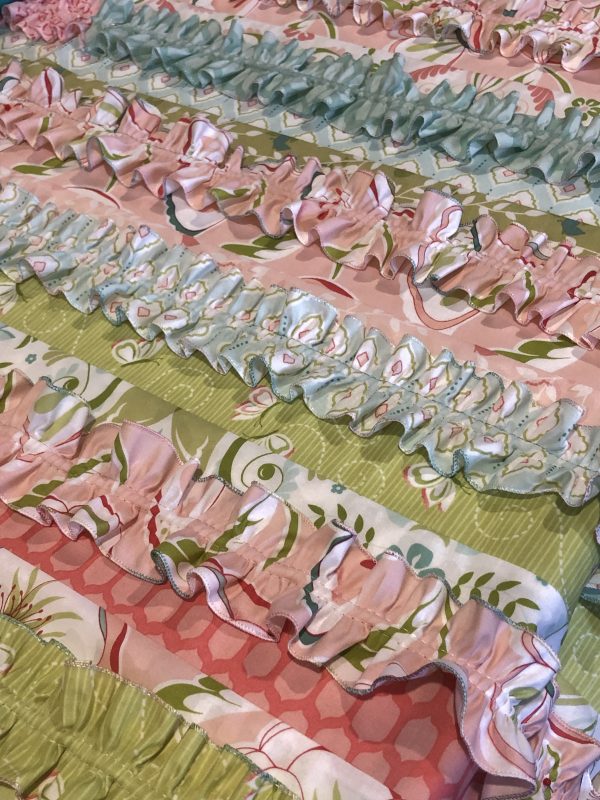 Bernina Overlocker Gathering Feet can only be used whilst in the overlocking mode, however you can still gather fabric in Coverstitch or Chainstitch mode by engaging the Differential Feed to a setting of 2.0 and using one of the feet suitable for these stitches, e.g. #C11 Combination Foot, #C13 Coverstitch/Chainstitch Foot or the clear versions of these feet #C27 or the new #C28. I made a lovely quilt some time last year and made ruffles to attach to the top. I roll hemmed the edges first, and then gathered them with a 3-Thread Wide Coverstitch. Here’s some photos to show you how lovely those ruffles turned out. I ‘quilted’ them onto the quilt, with my B990 Sewing Machine and Walking Foot #50.