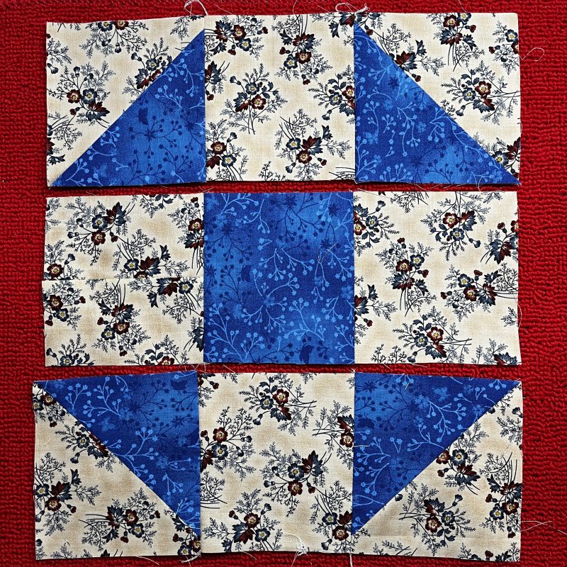 Sample Prep: Cut 4 squares @ 4 ½” Light fabric, and 1 square @ 4 ½” Dark fabric (Centre square in this case) + 2 squares @ 5 ½” light fabric and 2 squares @ 5 ½” dark fabric for Half Square Triangles for corners of block.