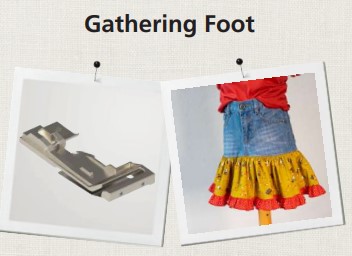 The gathering foot, designed for use with machines in the Overlocking mode only, has an opening that guides fabric between the top portion of the foot and the gathering plate. This allows you to gather one layer of fabric while attaching it to the fabric that will not be gathered.