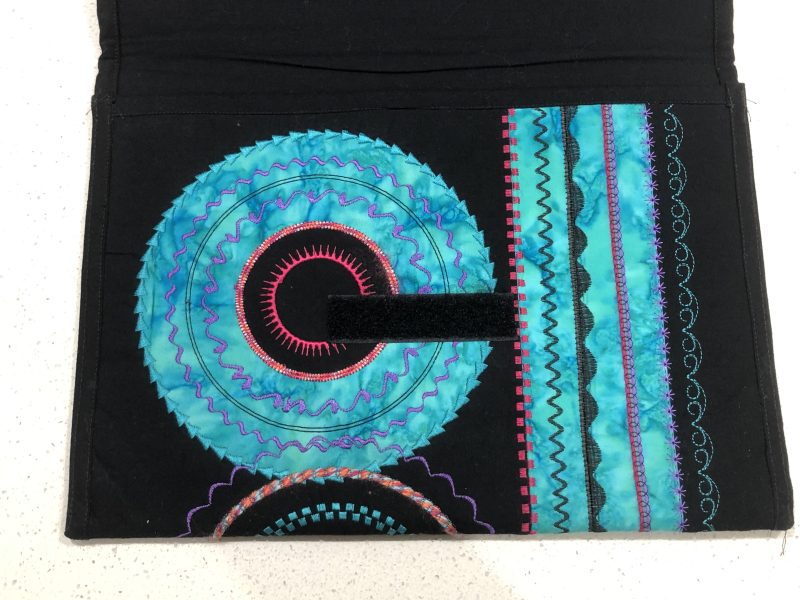 ‘Appliqued Circles’ – I had an embroidered design as a sample stitchout from my B990 (Accents Folder for those interested) and appliquéd it to my base black fabric using Wonderfil Fabulux variegated thread. It went perfectly with all the Wonderfil Polyfast threads I’d used in the design.