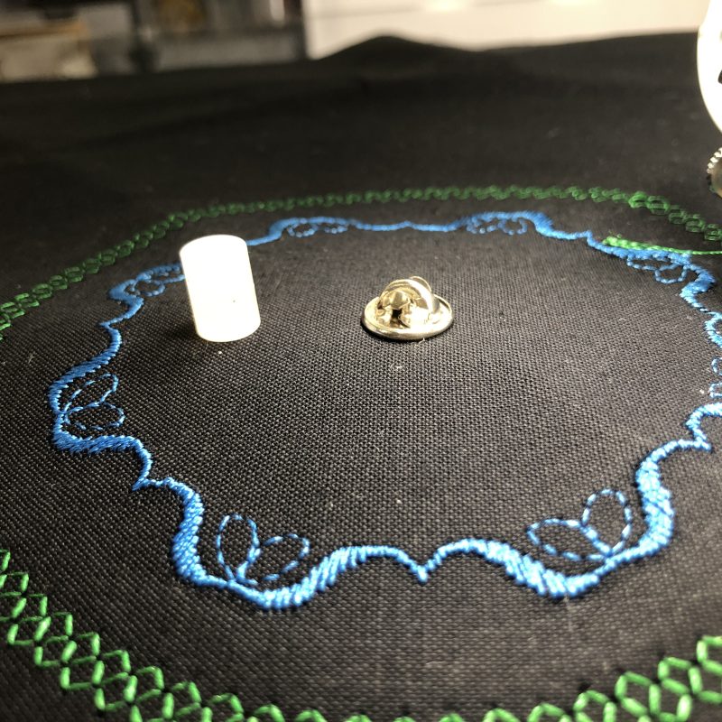 For the words ‘Circular Embroidery Attachment’, I changed the attachment over so that the pin was to the right of the needle. The baseline of the letters will now be towards the outside of the circle.