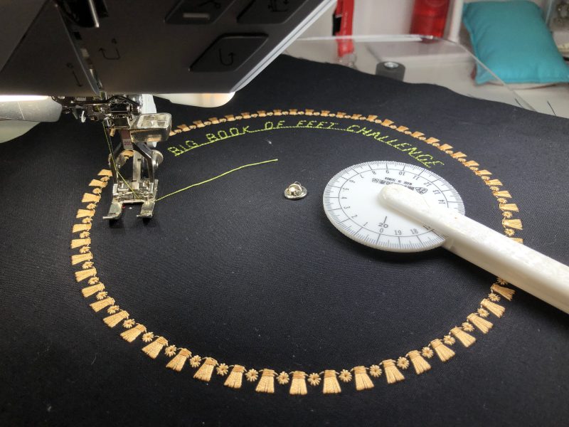 ‘Circle Writing’ – Before I did the writing, I stitched a few rows of decorative stitches. The outside row was fun to stitch first, and I used Tassel Stitch #1115 – I brushed out the tassels with a little disposable style of mascara brush I had. The inside circle of stitches were stitch #334 in orange, and then over the top I stitched a combination of groups of #711 in two different sizes. The yellow row was Triple Zigzag Stitch #7. Then it was time to have a bit of fun with the lettering – first I stitched ‘Big Book of Feet Challenge’ with the attachment as per all the other rows of stitching, pin to the left of the needle. The baseline of the letters was on the inside of the circle.