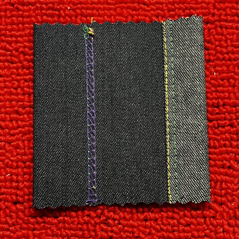 I find this foot great for topstitching seams, and in this sample I overlocked the seam, before topstitching with 3-Thread Wide Coverstitch #22 – Left Cover and Right Cover needles.