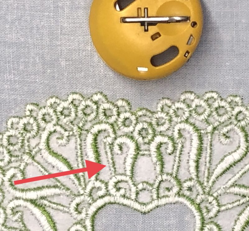 I threaded up the top with some lime green rayon machine embroidery thread – and the bobbin with white Bobbinfil, using the standard black bobbincase that is supplied with the machine. The first sample stitched out well, however the edge of the design had ‘glimpses’ of the white bobbin thread showing.