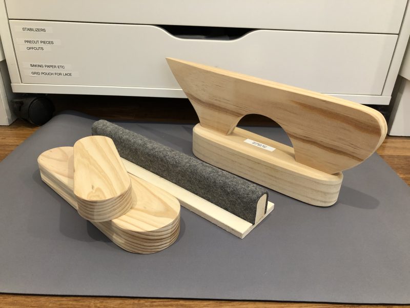 As I stitch out samples every week, I use so many different ‘tools’ that I have gathered over the years in the Studio and this group of tools, along with our irons, give us the quality finish we are all seeking with our patchwork, and garment making in particular. Let’s welcome … the Pressing Aids!