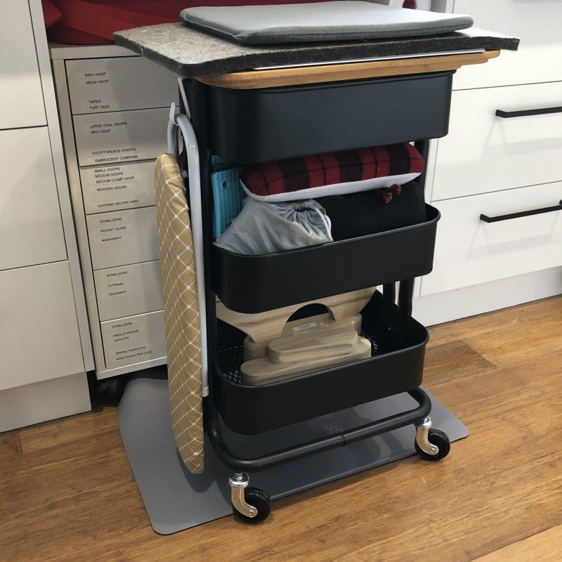 I have three Ikea RASKOG wheeled trolleys and two smaller RASHULT wheeled trolleys in use up in the Studio. They all have their individual ‘jobs’ to do … one Raskog holds the majority of my vintage-style basket making supplies, another has my ‘Current Projects’ in (gosh, can’t remember the last time I took one OUT of there to finish!), and the third one has been ‘hacked’ to create a Storage Trolley for longer rolls of vinyl, stabilizers, interfacings etc. I’ll share the details on that one another time as it’s another of my ‘Sewing Gypsy Hacks’ …