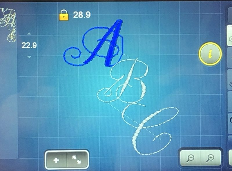 ‘Large Monograms’ – I found the stitches slow to move on the screen for placement where I wanted them, so used the Multi function knobs instead. Marginally faster, however, needed some patience with this sample at screen level, and when stitching out. I found my stitched out samples did not correspond with the letter positioning on the screen (they actually nestled very closely on the screen). Maybe I need to play a little more with this …