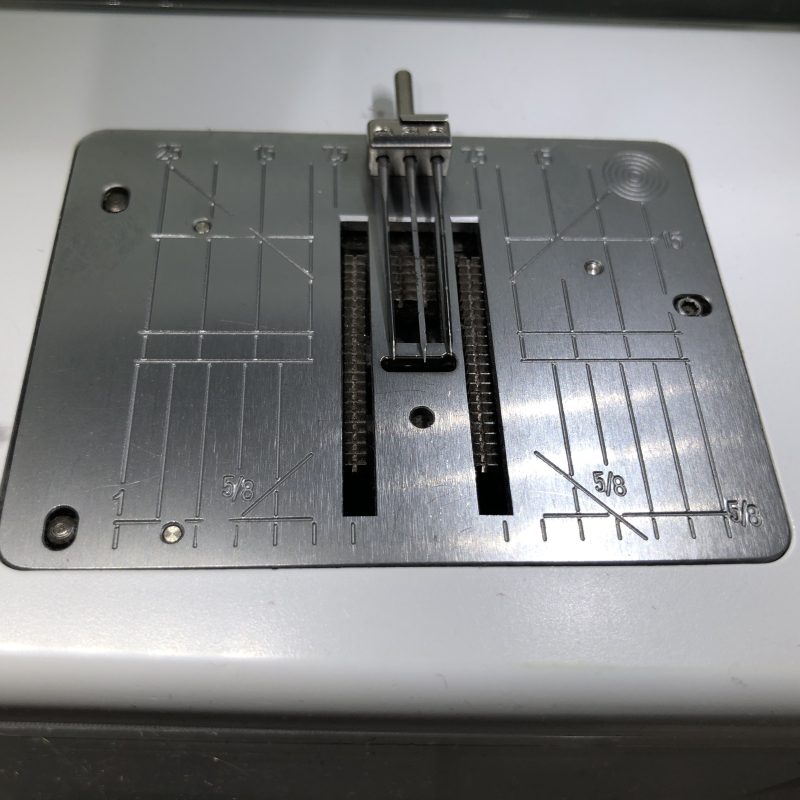 4 Series Machines – The Rotary needle punch stitch plate with the three holes that I use on my 5 and 7 series machines (both 9mm stitch width machines), would not sit down properly on my 4 Series machine (5.5mm stitch width machine) due perhaps to the difference in width of the feed dog area (even though it was in the lowered position), so I used the standard 5.5mm stitch plate and went ahead to punch successfully.
