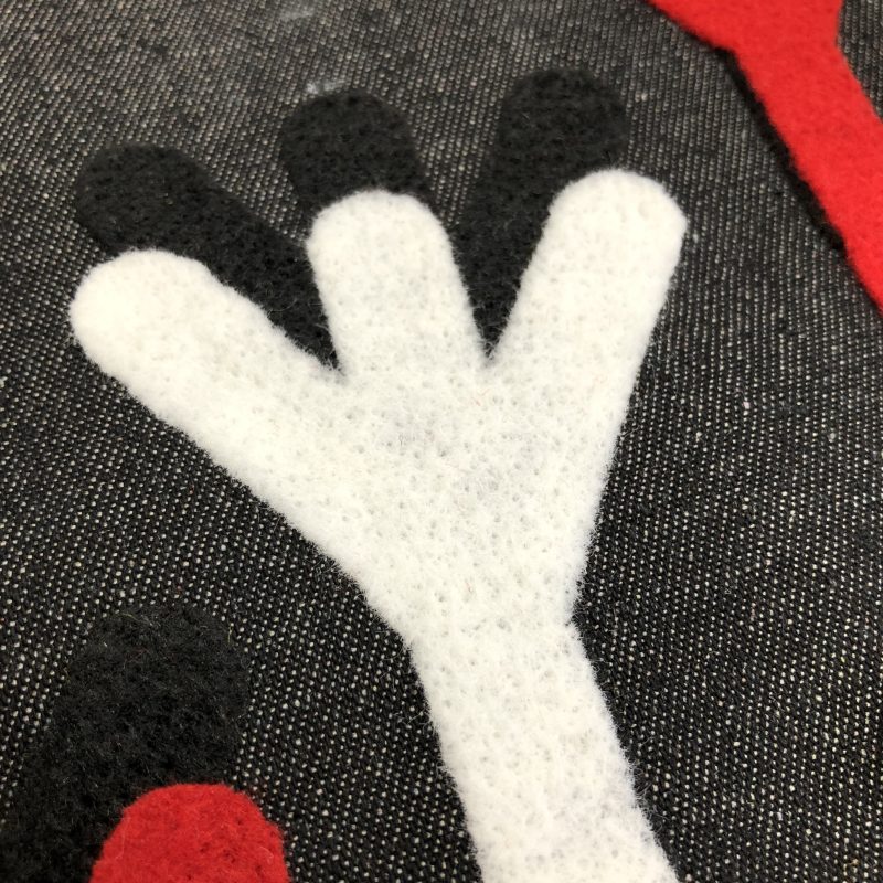 The rest of the ‘Owl Prints’ I needlepunched down onto denim again, and after realising the black just didn’t show up much, I used them as an underlayer, like a shadow. All went well, until I decided to turn it over and punch from the back as well – the black came through the red as i mentioned above! So … snipped up some leftover bits, and punched those into place to disguise it a bit. Always something to learn!