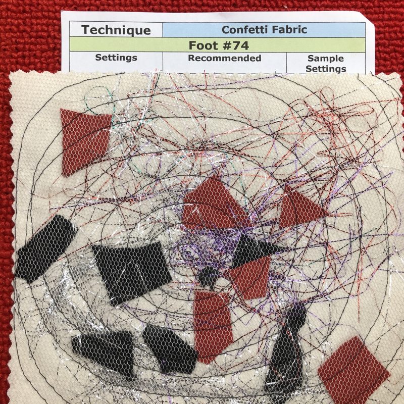 ‘Confetti Fabric’ – this technique is one I have used many times over the years, and I love how different coloured net/organza changes the look of the finished sample. I chose cream net over the cream fabric, had little pieces of leather scraps, and frayed some lame fabric for the ‘sparkly’ scattered fibres. I stitched a simple spiral to cover it all, and again the foot glided easily over all the textures.