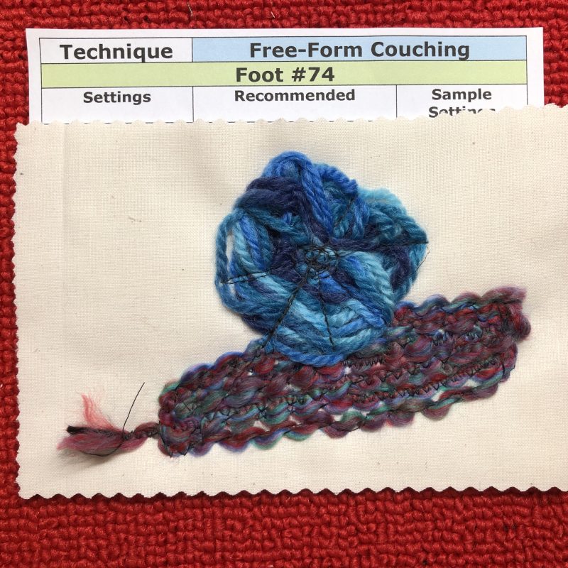 ‘Free-Form Couching’ – I played with straight stitch and zigzag for this sample. I coiled the variegated aqua yarn into a circle shape and stitched over it without anything being caught in the foot. The cup shape foot moved easily over the yarn.
