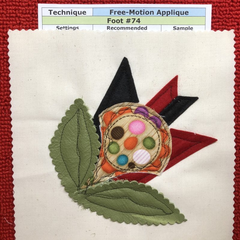 ‘Free-Motion Applique’ – I had some felt offcuts from when I did the CutWork Tool and some leather scraps from the hexagons I cut out to use in another sample. In the basket of fabric samples I use for the blog, there was a clamshell shape already cutout so I used that for the centre of the design. There were some very bulky areas to stitch down, and Foot #74 did a fabulous job, never catching on anything previously stitched down.