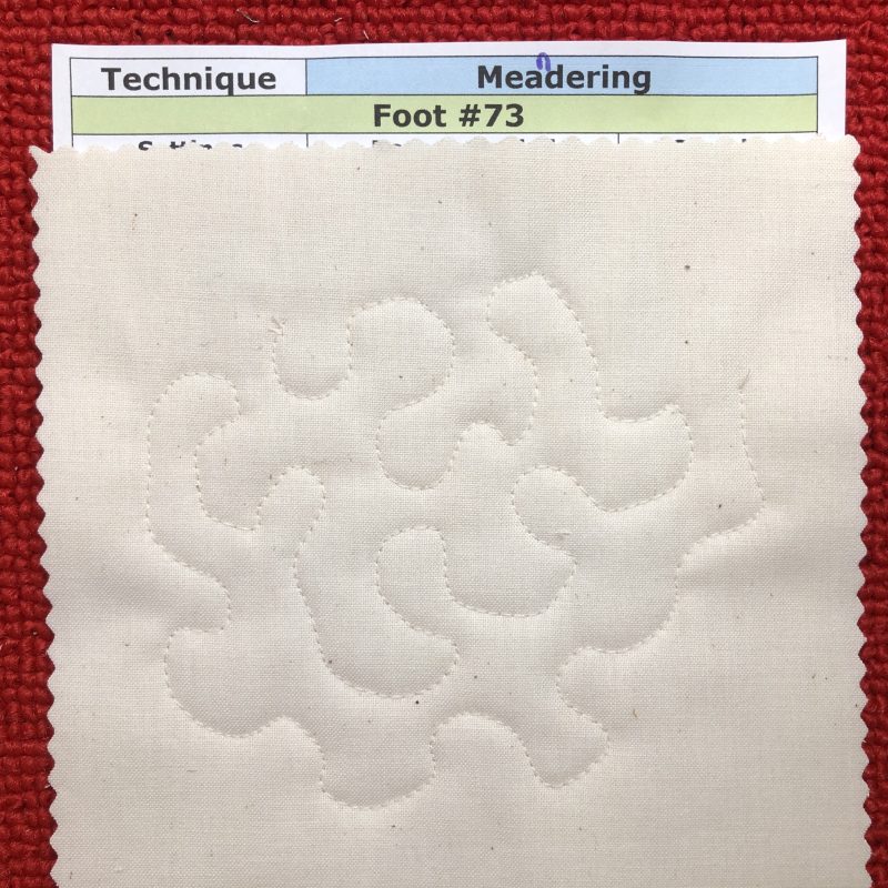 ‘Meandering’ – I set up for SPI (Stitches Per Inch) 10 and ‘wriggled’ my way around the sample. Great to have a regulated stitch with any freemotion foot! Easy to see where I was headed as the foot has a gap in the front.