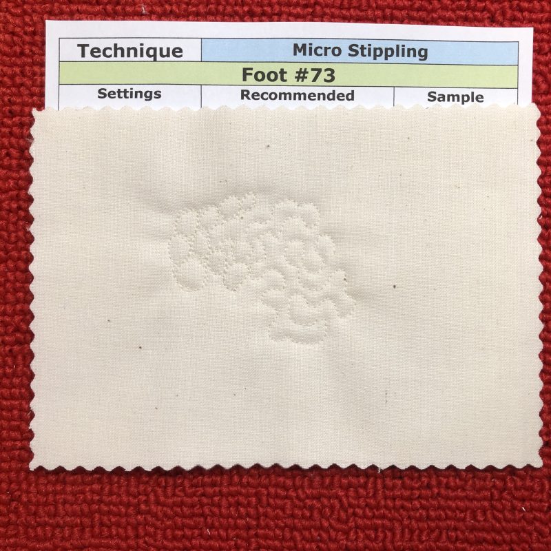 Stippling Foot #73 Designed for stippling, micro-stippling, and swirl patterns, this foot has a wide opening for better needle visibility. Its matte gray finish reduces glare, minimizing eye strain during detailed stitching.